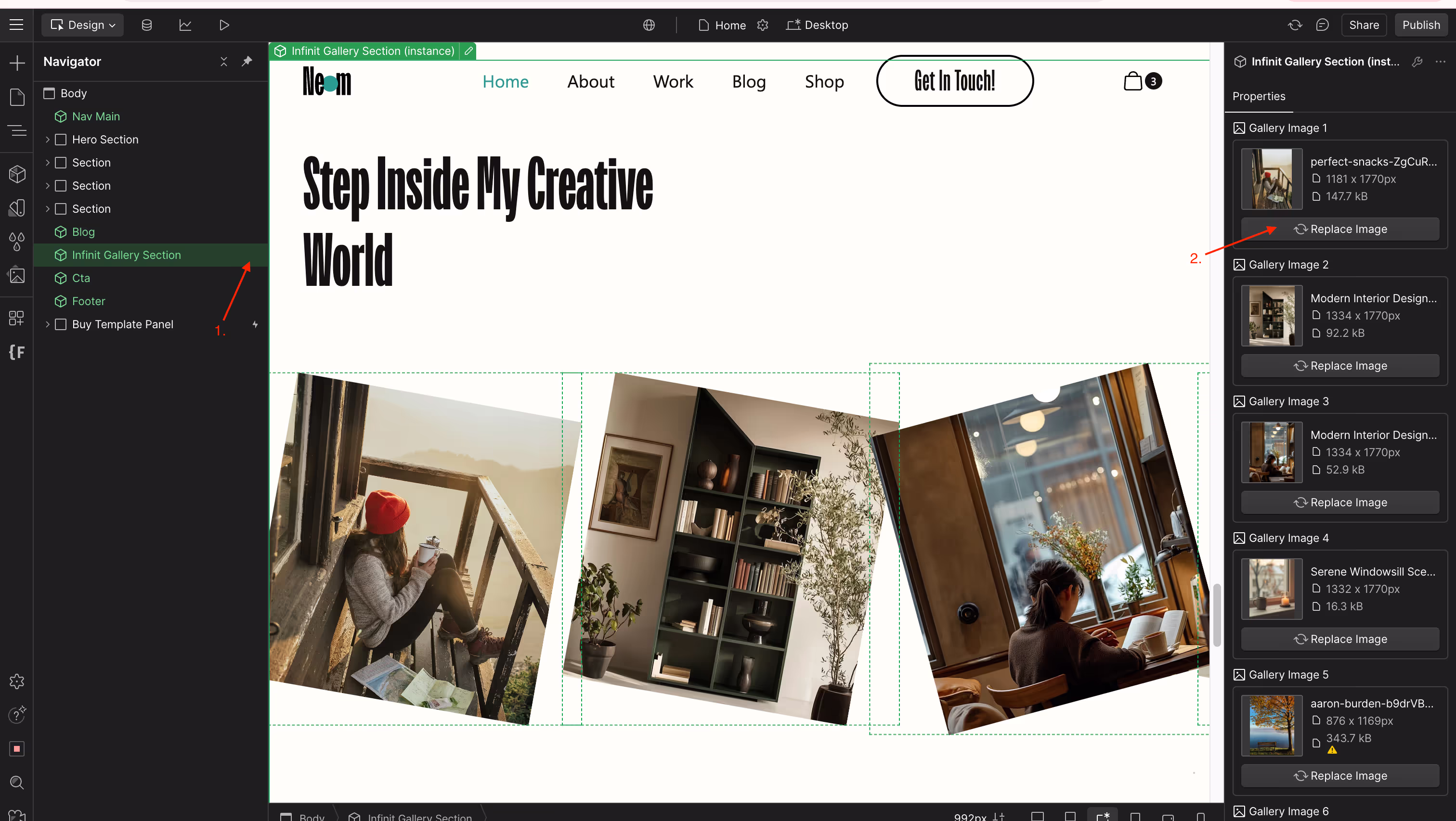 1. Click the Infinit Gallery Section component2. Update images (#1 & #2)Enjoy :)